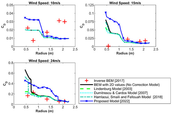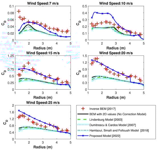 Figure 12 compares the estimated value throughout the blade length using BEM without or with the correction models for stall delay using the values obtained through the Inverse BEM method of CFD analysis at wind speeds of 7 m/s, 10 m/s, 15 m/s, 20 m/s, and 25 m/s for the NREL Phase VI turbine. The BEM utilising earlier correction models for stall delay predicts lower values than the determined from CFD analysis using the Inverse BEM approach. The values estimated based on earlier correction models for stall delay considered for comparison in this study are close to the values since these models do not account for drag coefficient corrections. On the contrary, since there was a divergence noticed in and for all wind speeds, a new model is proposed and compared in Figure 12. While previous models did not even approach the 3D values, the proposed model predicts extremely close at high wind speeds (15 m/s, 20 m/s, and 25 m/s) and relatively close at low wind speeds (7 m/s and 10 m/s). Figure 12 compares the estimated value throughout the blade length using BEM without or with the correction models for stall delay with values obtained through the Inverse BEM method of CFD analysis on wind speeds of 10 m/s, 15 m/s, and 24 m/s for the MEXICO rotor. Figure 12 and Figure 13 show that for the NREL Phase VI turbine, is often higher than , indicating that rotational effects were associated with a notable drag rise, but for the MEXICO rotor, rotational effects were associated with a small drag drop. Ivan Harreaz [] exploited OpenFOAM to do CFD simulations of the MEXICO rotor and calculated sectional and at three distinct wind speeds. Ivan Harreaz [] also noticed a similar discrepancy in predictions. Other drag correction models, such as those by Chaviaropolous and Hansen [] and Raj [], anticipate an increase in , but the Corrigan and Schillings [] and Du and Selig [,] models predict a decrease in . Other models, such as those by Snel [], Lindenburg [], Dumitrescu and Cardos [,,], and Hamlaoui , Smaili and Fellouah [], have not proposed models or taken into account a discrepancy. In fact, it can be noticed from Figure 13 that there is no discernible difference between the and values for the MEXICO rotor. Furthermore, according to Ivan Harreaz [], rotational effects have minimal influence on (except at r/R = 60 percent). Guntur et al. [], who used the MEXICO rotor to evaluate correction models, came to the conclusion that correction may not be essential. Ivan Harreaz [] concluded that the effect of rotation on drag appears to be aerofoil-type dependant, which we concur with. Since, as stated in Section 1 of this paper, the main concern of this work is to predict lift enhancement due to stall delay. Further, the effect of rotation on drag is minimal compared to its effect on lift, and because this work employs a novel dimension of using Machine Learning (ML), we propose a preliminary model for drag correction depending on the predictions of the NREL Phase VI turbine. Despite the fact that this model is dependent on NREL Phase VI turbine data, the forecast for the MEXICO rotor is still close. In the future, an additional relevant parameter representing aerofoil type will be taken into account, and a new model for drag correction with greater accuracy will be built that enables forecasting of both increases and decreases in the drag coefficient based on aerofoil type.