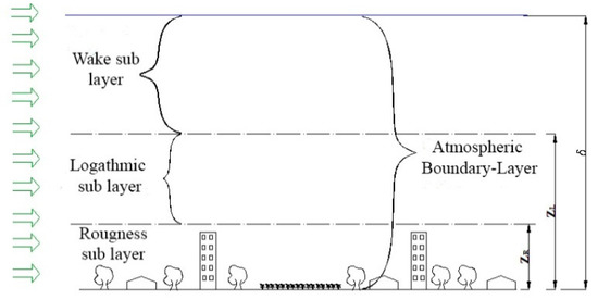 The atmospheric boundary layer (or planetary boundary layer) is the portion of the atmosphere closest to the earth’s surface. In this planetary boundary layer, several sublayers are identified according to [22,23] such as in Figure 1. In the wake and logarithmic sub-layers, an analytical model can describe the mean velocity profile. At the same time, the roughness sub-layer is a non-homogeneous flow region imposing changes to the vertical velocity profile. When the wind blows over a city, inside the roughness sub-layer, the flow occurs in an urban environment composed of multi-block low-rise and high-rise buildings and squares, trees, and shorelines.