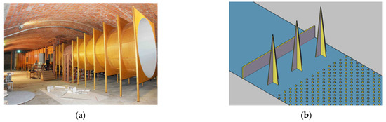 The Wind tunnel is an open section type with a test section of 17 m long, 2.25 m wide, and 2.1 m high, which is illustrated in Figure 3a and is installed in the School of Engineering of the Universidad de la República in Uruguay. The wind tunnel can provide a constant wind flow or a well-defined wind profile if coupled with an artificial Standen method [35,36] (Figure 3b) which can reproduce any vertical wind profile according to the desired roughness and mean wind speed for the free atmosphere, keeping the temperature and atmospheric pressure constant during the experiment.