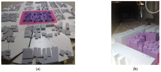 The urban area and the approximation region were modeled at a geometrical scale of 1/100. Figure 4a shows the model, including the urban area highlighted in purple and the surrounding in grey. Figure 4b shows the IFA 300 hot wire/film anemometer of three channels under operation, which can measure the three components of the wind flow. Data acquisition was performed with a National Instruments A/D card and a programming code to read the data developed in CVI Lab Windows. The IFA 300 hot wire/film is mounted in a four-freedom degree positioner system, as shown in Figure 4b. The central urban area—in purple—is prepared to rotate 360° degrees to model the wind flow effect from any angle.