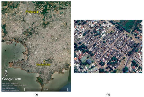 (a) Montevideo City with the location of the urban area under study merged in the surroundings of the Peñarol area; (b) zoom overused area for the case study.