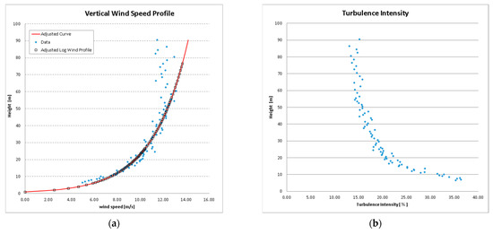 (a) Estimated vertical wind profile at the surrounding urban area; (b) the turbulence intensity distribution by several reads at different heights up to scaled 90 m height.