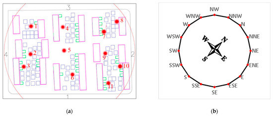 (a) Location of the 11 probe points in the wind tunnel to infer the wind flow at three different heights above ground level; (b) Sixteen-degree rotating sectors (according to wind rose) for probing the data according to the projection of (a).