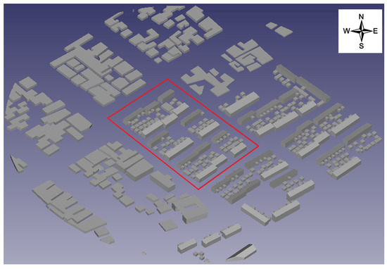 To represent the urban area and its surroundings, a prototype scaled at the 1/100 model was created. The model includes the area of interest and its surroundings, forming a circular area with a 200 m radius (from the central point of the area under study, red rectangle in Figure 11). The circular model of the urban area is depicted in Figure 11.