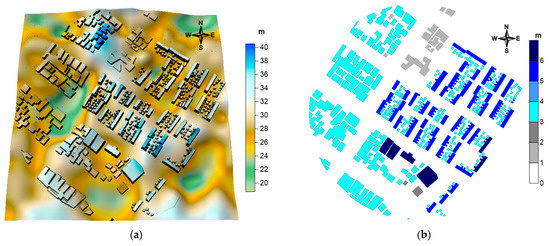 (a)—Digital urban terrain model of the urban area for WAsP Engineering and WindSim models—Vertical exaggeration of 1.5×; (b) Buildings height.