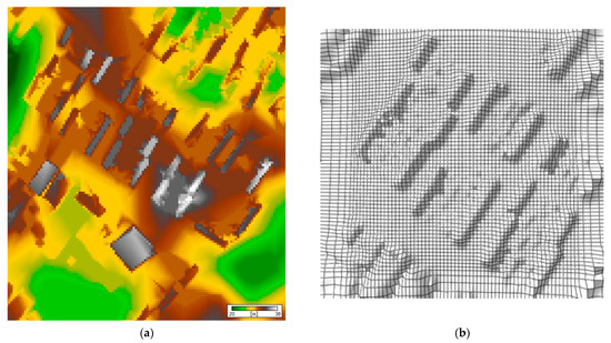 (a)—Digital urban terrain model at 0.5 m × 0.5 m spatial resolution computed by WAsP Engineering; (b) Regular nested mesh generated by WindSim model for the central urban area with 2 m × 2 m spatial resolution.