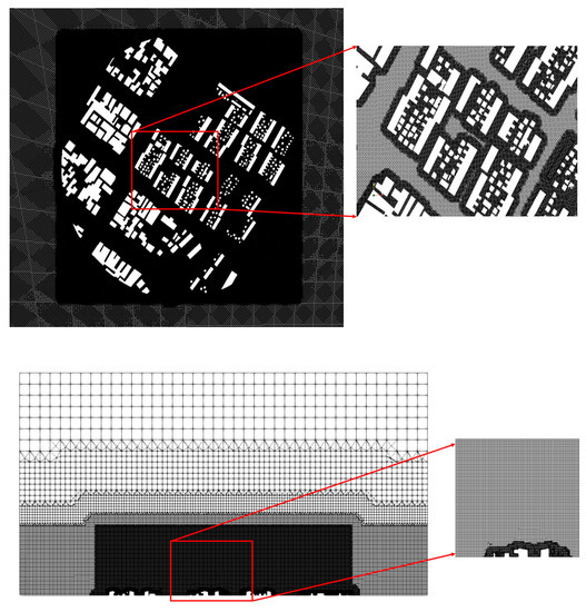 In OpenFOAM, an STL file with the geometry of the urban area of interest was created for the generation of the computational domain geometry. Using the SnappyHexMesh tool. The whole domain consists of a box, which was rotated to be aligned with the inlet direction. The mesh comprises hexahedral elements and contains two zones, a circular subdomain to frame the building’s zone and another for the rest of the domain. The circular area was refined (buildings area) in order to detail and better characterize the building’s zone where the largest velocity and pressure gradients will occur. The k-e standard model was adopted as the turbulence closure model.