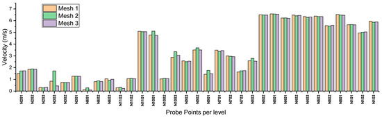 A mesh independence study with an imposed hypothetical vertical wind profile was performed to guarantee the independence of the results with the size of the adopted elements (see Figure 16). To do this, a simulation was performed with three different meshes, reducing the size of the elements of both regions. Mesh 1 has 22.9 million cells, Mesh 2 has 18.2 million cells, and Mesh has 25.4 million cells. Values of velocity were taken at probe points per height and compared with results obtained from the wind tunnel adapted to the hypothetical vertical wind profile. Mesh 1 is used in OpenFOAM, considering the calculation accuracy and convergence velocity presenting slightly fewer deviations than Meshes 2 and 3.