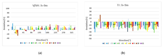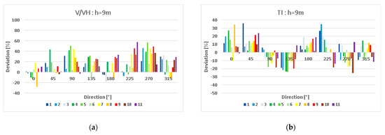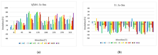 Mean absolute deviations of the wind (a) and turbulence intensity (b) per direction for the 11 probe validation points at height h = 9 m with OpenFOAM.