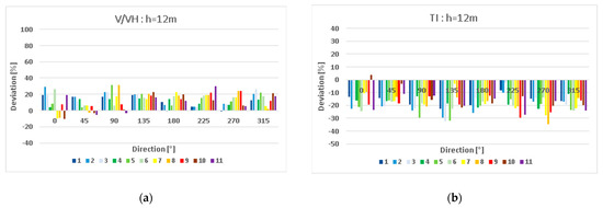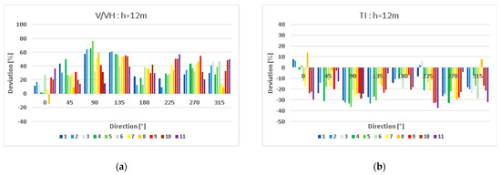 Mean absolute deviations of the wind (a) and turbulence intensity (b) per direction for the 11 probe validation points at height h = 12 m with OpenFOAM.