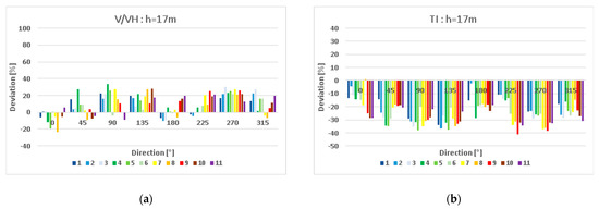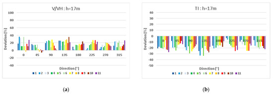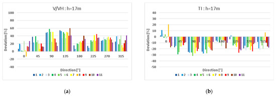 Mean absolute deviations of the wind (a) and turbulence intensity (b) per direction for the 11 probe validation points at height h = 17 m with OpenFOAM.