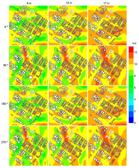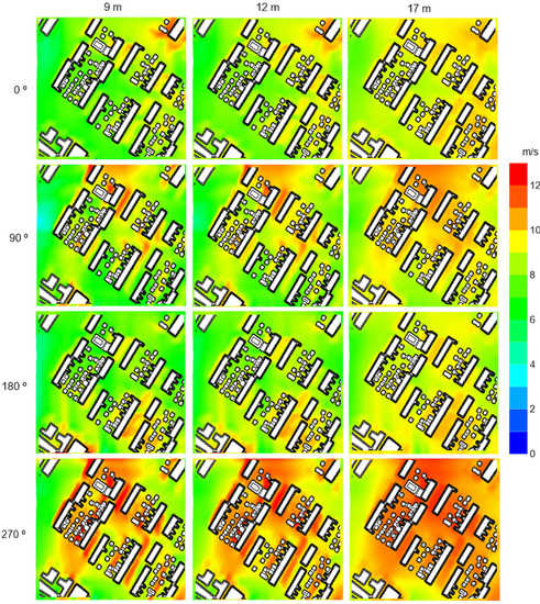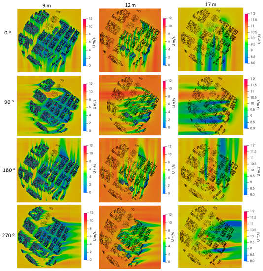 Mean wind speed estimates obtained by the WindSim model for three heights (9 m, 12 m, and 17 m) and four wind sectors rose (0°, 90°, 180°, and 270°).