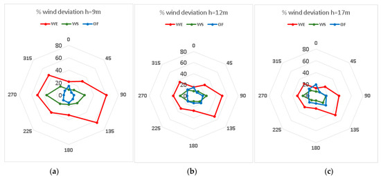 Overall mean wind speed absolute deviation per points 1, 2, 3 and per height (a)—9 m, (b)—12 m, and (c)—17 m above ground.