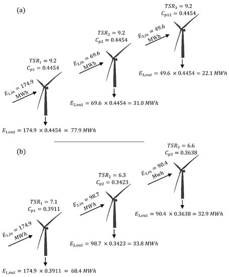 What is this article’s proposed solution and its rationale? The proposed solution is to deviate from the TSR that maximizes an individual turbine’s efficiency in the interest of the entire farm as a whole. Such deviation would decrease the adjusted turbine’s production; however, it weakens its wake, increasing its downstream counterparts’ output. Figure 1 presents a small sample of the data generated in this research to provide a better demonstration of the proposed solution. The figure illustrates the solution for a three-turbine section of a column within a wind farm for one wind direction aligned with the column. Figure 1a shows the case of maximizing every turbine’s efficiency. The maximum achievable power coefficient for the studied turbines (SWT-2.3-93) is 0.4454, which one can achieve by setting the TSR at 9.2. Turbine manufacturers provide such data. The first turbine produced 77.9 MWh per year in this wind direction. The overall amount of energy reaching the second turbine was 69.6 MWh, leading to its production of 69.6 MWh × 0.4454 = 31.0 MWh. The energy received by the third turbine throughout the year in this wind direction was 49.6 MWh, resulting in the production of 49.6 MWh × 0.4454 = 22.1 MWh. Hence, these three turbines’ total annual energy production in this one direction was 131 MWh. Figure 1b shows the production of these turbines after adjusting the TSRs. The efficiency of all three turbines decreased to 0.3911, 0.3423, and 0.3638, respectively. Hence, the production of the first turbine decreased to 68.4 MWh. This increased the energy received by the next two turbines so that their production increased to 33.8 MWh and 32.9 MWh, although their efficiency had decreased. The total annual energy production in this wind direction increased to 135.1 MWh, 4.1 MWh (~3.13%) more than the baseline case.