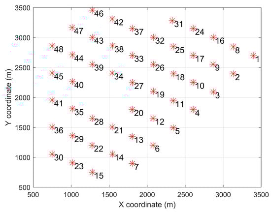 The study used Lillgrund, an offshore wind farm in Sweden, to investigate the solution proposed in Section 1.3. This wind farm includes 48 SWT-2.3-93 wind turbines, with a rated power of 2.3 MW and a rotor diameter of 93 m. To implement the proposed real-time TSR optimization, one needs to know the farm’s layout, the power curve, the and curves, and the wind direction and speed distributions. Figure 2 shows Lillgrund’s layout. Figure 3 illustrates the power curve of SWT-2.3-93 turbine used to calculate the energy production at every wind speed. The variations of power and thrust coefficients ( and ) with TSR are given in Figure 4. Figure 5 presents the wind data collected at the hub height, i.e., 63 m. The wind speed distribution in every direction corresponds to Weibull parameters of and .
