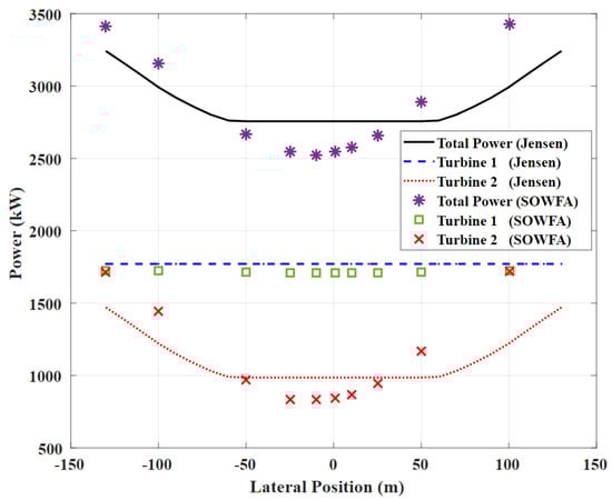 The authors conducted a validation study to ensure that the Jensen model’s implementation was correct. The model was applied to a case of two NREL 5-MW wind turbines with an axial distance of 7D, with D = 126 m being the rotor’s diameter, identical to that of Gebraad et al. [31]. Ten different cases were made by changing the lateral distance from −140 m to +140 m. Figure 6 compares the Jensen model’s predictions of the power production of turbines 1 and 2 and the total power production with those obtained from large-eddy simulations. Data presented in this figure not only confirms the correct implementation of the Jensen model but also shows the reasonable accuracy of this simple model. This performance is not surprising since the literature heavily confirms the Jensen model’s effectiveness in modeling a broad range of wind farms, from structured and unstructured layouts and packed to widely-spaced wind placements, both in aligned and non-aligned wind directions.