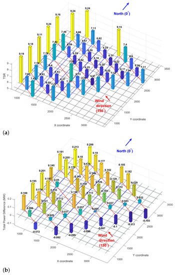 It is worth first focusing on one wind direction to put the proposed strategy into perspective. Figure 7 details the TSR optimization in the wind direction of 150¼ from the north using meteorological convention. In this direction, the algorithm suggested dropping the front-row turbines’ TSR by approximately 21–23% (Figure 7a). It then decreased the TSR by an additional 9–15% from the front- to the second-row turbines and kept it approximately uniform until the last three rows. The algorithm raised the TSR within the last three rows so that the last-row turbines’ TSR reached the baseline TSR of 9.2. Note that two of the columns partially deviated from this trend. The farthest left column had only three rows; hence, while, like for every other column, the algorithm dropped the front-row turbine’s TSR by approximately 20% and assigned a TSR of 9.2 to the last-row turbine, the adjustment recommended to the second-row turbine’s TSR was very slight (almost an additional 5%). The other unique column has a gap between its third- and fourth-row turbines. This gap was due to the shallow waters at that spot, preventing the developers from installing two of the Lillgrund turbines. That gap allowed for a better wake recovery; hence, the algorithm did not find it necessary to drop the other rows’ TSR by too much. Like every other column, the TSR assigned to the last row was 9.2.