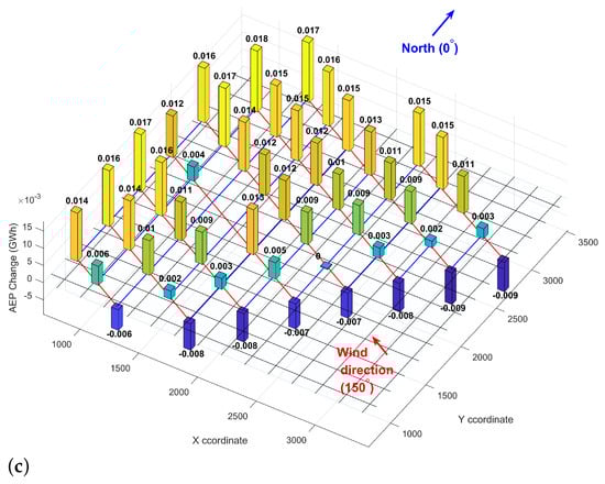 As expected, dropping the front-row turbines’ TSR decreased their power and energy production. Overall, in this specific direction (150¼), the summation of the power and energy drop in the eight front-row turbines was 0.75 MW and 62.47 MWh (Figure 7b,c). However, every other turbine’s power and energy production increased. The power and energy gain became more significant as the wind moved towards the last row. The summation of all the power and energy gains appeared to be 5.34 MW and 439.78 MWh for 150¼. Therefore, applying the wind farm TSR optimization in this wind direction led to a net gain of 4.55 MW and 377.31 MWh in power and energy production, equivalent to a 25.5% increase. Note that 150¼ is a direction of alignment (wind direction and turbine columns are aligned). Wake losses are generally much larger in the alignment directions; therefore, the strategies aimed to address wake losses appear more effective in such wind directions.