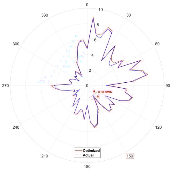 Wind farm’s AEP (GWh) in every wind direction with and without TSR optimization.