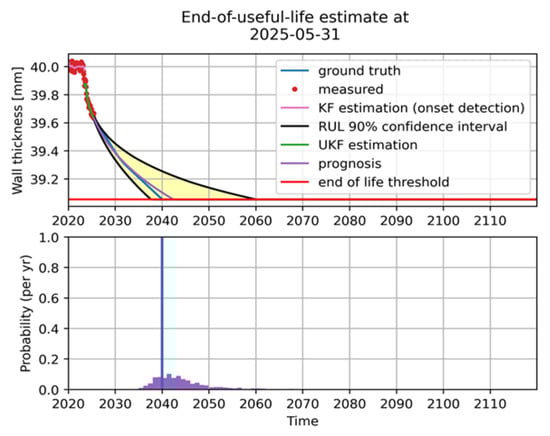 Corrosion prognosis is achieved by extrapolation, i.e., by iteratively computing a priori estimates of next states. In the example, since A and p are constants, this amounts to using the formula . Moreover, Bayesian filtering keeps track of a probability distribution describing for each possible state the likelihood that state is the actual state of the system. In this way, we can compute, e.g., a 90% confidence interval for the current state and future states (for the latter assuming non-dominant process noise). The probability distributions computed at all monitored positions locally is used as input to the system-level prognosis step described in the next section (see Section 3.3).