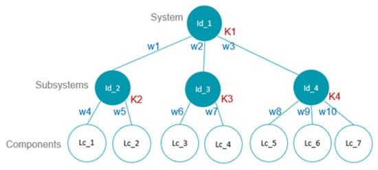 Therefore, we propose a flexible structure for defining the system reliability, namely, the system may consist of subsystems, which at the same time may consist of other subsystems, and so on (in a nested way). The reliability of a given (sub)system is then modelled by a weighted k-out-of-n structure. This is better expressed as a tree structure (see an illustration in Figure 3), where each parent node has a k value, and child nodes have an associated weight w. The leaves of such a tree correspond to the components, whose un-reliabilities are associated with the local RULs of the measurement locations. In addition to flexibility, the proposed structure allows for a systematic and easy calculation of the system reliability departing from the algorithms described in [23].