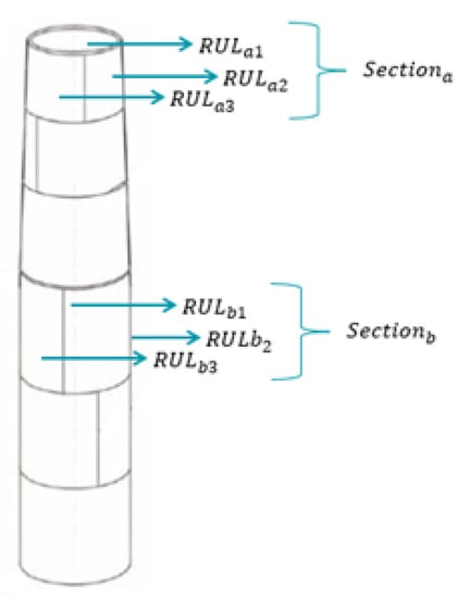 Examples of reliability studies for structural applications may be found in references 1–12 of [24]. Here, we present a rationale to illustrate the suitability of this flexible structure for computing the system reliability (see Figure 4). For a given measurement location, the prognosis module estimates the local RUL due to (uniform) corrosion, which characterizes the status of a delimited area of the tower. We may then define a section of the tower, for which we can measure at multiple locations, and consider the tower as an arrangement of sections with different weights or contributions to the system reliability. These weights may be related, for instance, to structural properties such as load levels.
