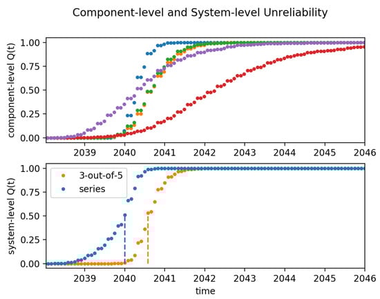 Component-level Top pane: Component system Unreliabilities (top pane, 5 components each depicted with a separate colour (including: blue, purple, orange, green, and red) and Bottom pane: Resulting system-level unreliability ; with two timeseries: the series weighting of all component level unreliabilities (blue line) versus a weighting of the risk of failure of 3 out of 5 components (orange line), using the k-out-of-n: Good System Method. (blue line:) 5-out-of-5 (series connection) gives a 50th percentile at month ‘January 2040’; (orange line:) 3-out-of-5 gives a 50th percentile at month ‘August 2040’.