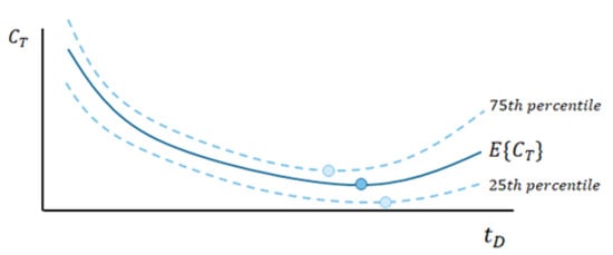 From a statistical point of view, this optimization is reasonable. It represents the minimization of expected outcome of a large population of evaluations of the cost function (each one corresponding to a different realization of the stochastic variable ). However, there is a chance that, for one evaluation (i.e., one realization of ), the cost function is higher than its expected value. Aiming for the expected mean value thus entails an economical risk. This is illustrated in Figure 6: the cost may be higher than its expected value (see, for example, the 75th percentile).