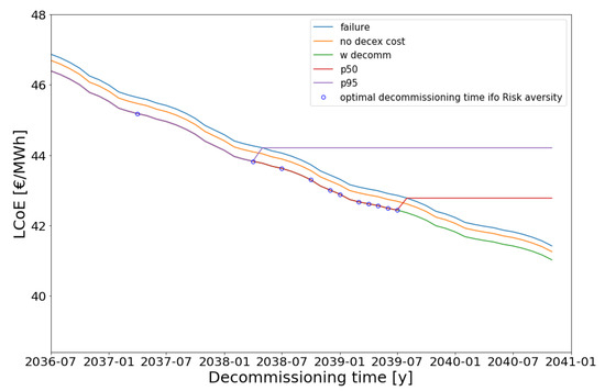 Figure 7 presents the LCOE as a function of the decommissioning time for the assumptions and scenario described above. It can be seen from this figure that a higher risk aversion term leads to a more conservative optimum for . Similar results were obtained for the TCO metric. The results are summarized in Table 1.