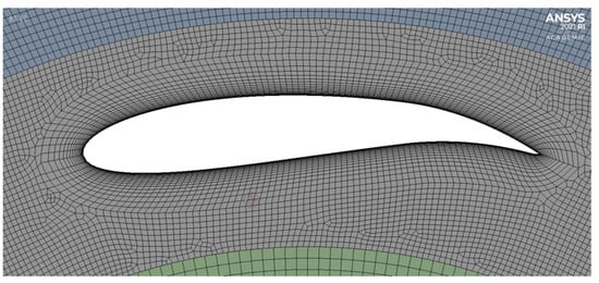 The geometry was imported into the meshing software within Ansys to create the mesh. This was done by applying a face sizing to each section and using sizing to create a denser mesh as it got close to the VAWT, with the densest section being the area containing the blades. This is because this area is expected to have the most variance in flow and is the main area of interest. An automatic method to create a quadrilateral dominant mesh was used on every surface, and inflation was also used around the blades to aid in capturing their complex shape. The mesh around the blade can be seen in Figure 3.