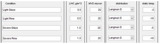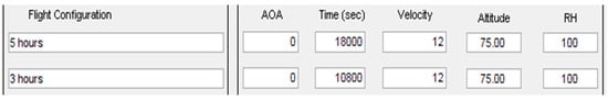 The ice shapes were obtained using LewInt, a free icing software that uses the LEWICE 3.2.2 ice accretion software code. To use the aerofoil shape as the geometry, the DAT file was converted into an XYD file. The chord length was set to the same as the simulations, and only the geometry of a single blade was used, as it was not possible to simulate rotation in the software. No thermal de-icer was applied, and the surface temperature of the blade was set to 273 K. The flight configuration and atmospheric configuration settings can be seen in Figure 4 and Figure 5, respectively. The velocity units are m/s, the altitude is in metres, and the temperature is in °C. The temperatures, LWCs, and median volume diameter (MVD) used were from categorisations made by EUMeTrain []. The velocity is the same as used in simulations, and the height is the average height above sea level of the UK. The altitude was varied, but very little change was observed. The times were determined based on observations made of the ice formations and any significant changes to the shapes. Verification was also performed using values used by Li [] in icing wind tunnel experiments.