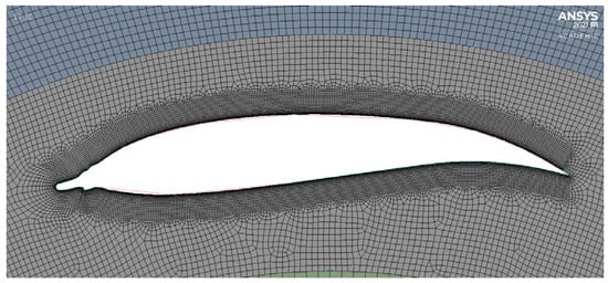 The ice shapes were imported onto the geometry used in Section 3.4, with an additional edge sizing added around the blades to capture the ice shapes; see Figure 6. This was repeated for all eight ice shapes, and the results were compared to the clean blade results. The inflation had to be replaced with refinement for the mesh of the 3-h light glaze ice. Clean blade simulations were repeated with the adjusted mesh to verify it. The 5-h severe rime and glaze ice simulations were repeated at experimental scale.