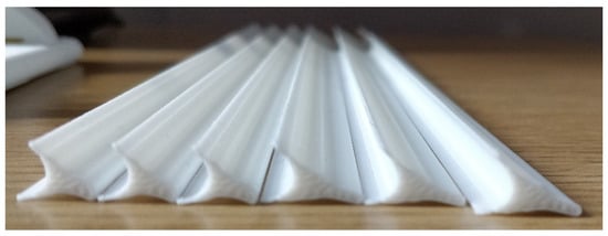 Two of the ice shapes were chosen and had their ice sections 3D printed. This was done by creating models in SolidWorks, exporting them as .stl files, then importing them into IdeaMaker to prepare for printing. The models were printed using PLA on a Raise 3D Pro 2 Plus 3D printer ( 3DGBIRE LTD, UK) and can be seen in Figure 7. Some of the shapes had errors at one of the ends, causing them to become rougher and contain small gaps. However, this was deemed to not be an issue, as the ice shapes were slightly longer than the blades they will be attached to.