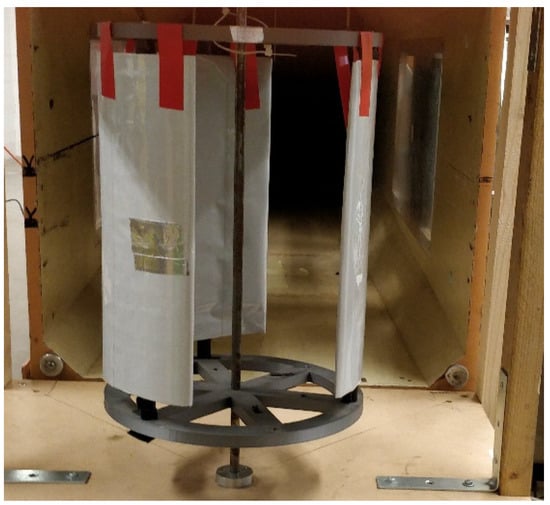 A wind tunnel was used to perform the experiments along with a scale VAWT model created by a previous student. The VAWT had a torque sensor build into it to measure the rpm, torque, and power generated. The torque sensor used was a Datum Electronics M425 Rotary Torque Sensor (Datum Electronics Ltd., East Cowes, UK), which connected to the computer through a PCB, where software was used to read the output. An anemometer was used to measure the wind speed of the tunnel, with speed being measured at the centre of the inlet and each corner before being averaged. The scale VAWT in front of the wind tunnel can be seen in Figure 8.