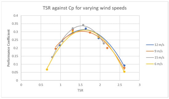 The curves show that the performance does not vary much with wind speed, with the maximum performance occurring at around 1.5 TSR for each speed. The 15 m/s wind speed did show a slightly higher performance; however, a narrower range of TSRs was tested. Based on these data, it was decided that 12 m/s would be used for further simulations. The curves obtained were also found to agree with curves obtained by Durkacz et al. [] and Li et al. [].