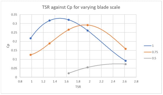 Simulations were also performed for different chord lengths by changing the scale of the blades. Scales of 1 and below were investigated to avoid getting too close to a cylinder. The performance curves can be seen in Figure 10. From the scales tested, the original scale showed the highest performance, with the 0.75 scale being close, but with the curve shifted to the right. Scales of 0.5 and 0.25 were also tested, but for the TSRs investigated, the performances found were mostly or all negative. Suggesting a scale of 0.5 or lower is not practical.