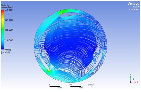 The mesh was imported into Fluent to prepare for simulations. The settings used can be seen in Table 1. The SST k-ω viscous model was chosen based on the papers reviewed in Section 2.3. The turbulent intensity, turbulent length scale, and turbulent viscosity ratio were chosen based on values used by Lanzafame et al. [] and Stout et al. []. Other values were tested, but the results did not differ enough to warrant changing them.
