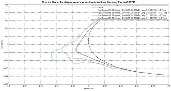 The ice shapes obtained from LewInt can be separated into 3-h and 5-h ice shapes. For each time, icing conditions that represented light and severe versions of rime and glaze ice were used. The obtained ice shapes can be seen in Figure 13 and Figure 14. The dashed line represents the clean blade; dark blue is light rime; green is light glaze; red is severe rime; and cyan is severe glaze. Only the leading edge is shown, as ice did not form anywhere else.