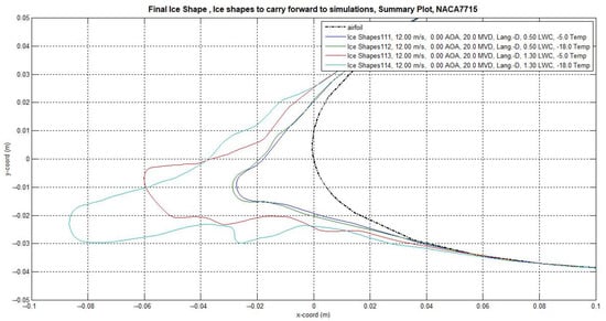 Verification was performed by obtaining ice shapes using the same conditions as Li et al. [] in their icing experiment. A comparison of two of the shapes can be seen in Figure 15. The shapes agreed on the general shape of ice formation at the leading edge, with the simulation being smoother. However, the simulation was unable to capture the ice formation on the trailing edge that was found in the experiments. Verification of ice shapes performed at different times agreed with the increase of ice thickness with time.