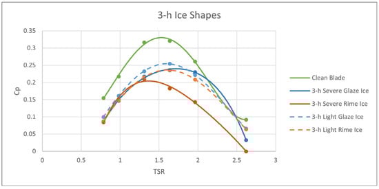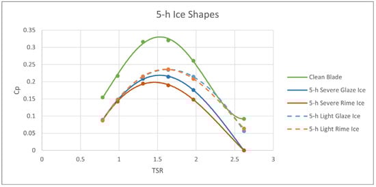 The performance curves obtained for the 3-h ice shapes and the 5-h ice shapes can be seen in Figure 16 and Figure 17, respectively. Both graphs contain the clean blade performance curve for the same wind speed as a comparison. It can be seen from the figures that all of the ice shapes had a significant effect on the performance of the VAWT, with a minimum peak power reduction of 20% occurring with the 3-h light glaze ice. The largest decrease in power was found in the 5-h severe rime ice conditions, with a decrease of 40%. Increasing from 3 h of icing time to 5 h caused a decrease in performance at every TSR for most shapes tested.
