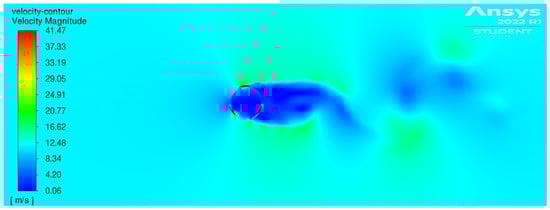 The velocity contour for the 5-h severe rime ice, see Figure 20, was investigated to see if there were any notable changes from the contour for the clean blade VAWT in Figure 11. It showed a similar velocity to the clean blade, with the notable differences being larger areas of high velocity around the blades and the velocity after leaving the turbine regenerating in a different manner. The maximum velocity was found to have decreased from the 44.2 m/s of the clean blade to 41.5 m/s.