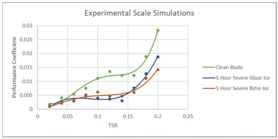 Scale simulations were performed to compare with experimental results for the 5-h severe rime and glaze ice. The performance curves can be seen in Figure 21. The simulations focused on low TSRs, as the TSRs used in the experiment are expected to be low due to a smaller radius and assuming a reasonable rotational speed. These curves showed a similar decrease in performance to that found in the full TSR range.
