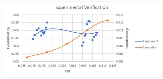 The performance curve obtained from the experiment can be seen in Figure 22 alongside the curve from the scale simulation. The results obtained from the experiment were separated into similar TSRs and averaged to reduce the spread of the results. The spread of the data caused a mostly flat trend line to occur, suggesting that the performance of the VAWT did not change much in the TSR range, whereas the simulation predicted a gradual increase in performance. This is likely caused by an assumption in the simulation but could also be caused the spread of experimental results, with more results at different TSRs changing the curve. The performance from the experiment was also much greater than the simulations, at around 4–10 times the performance at different TSRs. Additional verification using this experimental model was performed by Durkacz et al. [], where the performance at a 12 m/s wind speed was compared for experimental and two differing simulation methods. Durkacz et al. [] found a linear increase in performance with TSR for each method over the TSR range of 0.03–0.07, suggesting that with more data, a similar trend would be seen in the current experimental work. Durkacz et al. [] also found that the experimental values for performance were much greater than those found in the simulations.