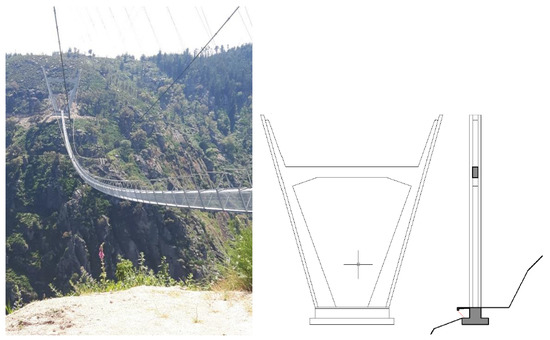 The bridge under analysis is of the suspension type and is516 m long—which makes it the longest of its kind—with a 1.2 m-wide deck with a remarkable sag running 175 m above the Paiva river in the North of Portugal. Having no deck level catenaries (usually seen in these kind of bridges, as in [2,12], for example, Figure 1) makes it unique, and having such characteristics makes it very flexible, with a swinging displacement first-mode of a very low frequency, which reinforces the need for wind tunnel testing.