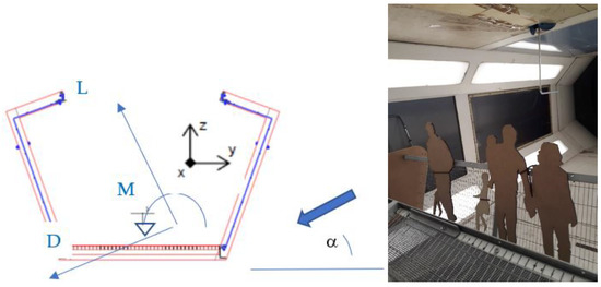 where ρ is the air density, U is the wind velocity, d = 0.301 m2/m is the sum of the exposed solid beams’ widths—deck beam + twice handrail beams + twice frame beams—and x is the distance from the gravity centre to the suspension, dGC (=628 mm). Only one deck beam was considered because of the shelter imposed by the deck floor mesh. For the other parts, the distance between them allowed the flow to recover while also loading the downwind ones. A second test was performed with “users”, including the silhouettes of a few persons on the deck, with the same length scale, only for horizontal wind (Figure 6).