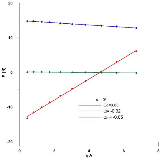 The aerodynamic forces and moments were then evaluated for a set of wind velocities up to Um = 12 m/s, and the respective aerodynamic coefficients, CL, CD e CM, lift, drag, and moment, respectively, were evaluated for each tested angle of attack according to Equation (3) via a linear regression applied to the pairs of F(U)—qA. See Figure 7, where an example of α = 0º is shown, where q = ½ ρ U2, and A is the reference area.