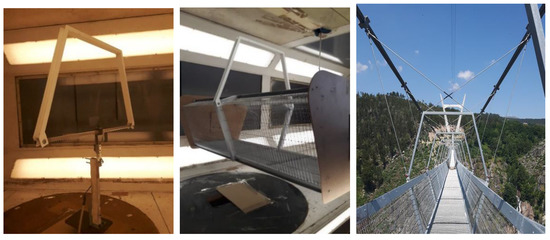 Only very few works on these types of bridges can be found in the literature as the large majority of suspended bridges are for road traffic. Since the Takoma Narrows accident (1940), such bridges are usually submitted to wind tunnel tests worldwide, for example, the ones referred to in [3,4,5,6,7].