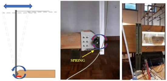 Also, as the fundamental mode corresponds to the displacements on the yy’ axis (Figure 6), and as the test conditions were unusual, the model suspension assembly was challenging. When swinging, the bridge displacement was in the flow direction, so the suspension springs also had to be positioned along the wind, leading to a change in the suspension system. The problem was overcome by assembling a system (similar to a metronome) using current springs—f = 0.5 Hz, 10 cm below the hinge—and a long enough lever (1.14 m) from the hinge to the suspension point to obtain the appropriate frequency at the wind tunnel mid height where the model is suspended (Figure 9). The load cells were attached to the horizontal deck suspension and the lever was attached to register the “displacement” (via the change in the applied force). However, this system has limitations as the model moves along the wind due to the drag up to the physical limit of the test chamber limiting the maximum test wind velocity.