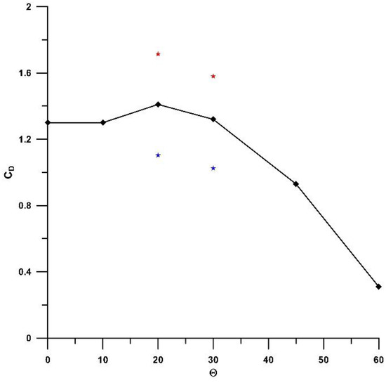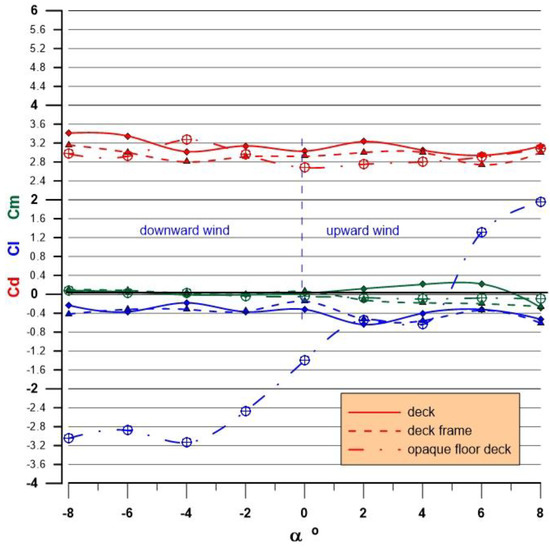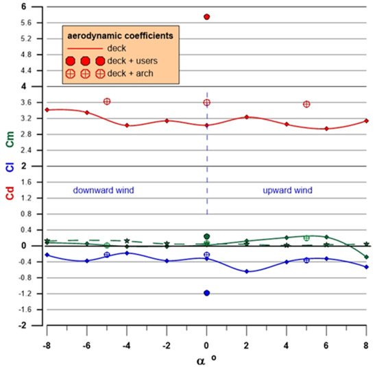 The first phase of tests referred to the initial design configuration—deck, guards, and handrail—for angles of attack of −8º < α < 8º (Figure 6), corresponding to downward and upward wind, respectively, followed by the α = 0º incidence with the users’ silhouettes—three adults and two children (Figure 6). The second phase included the arch, allowing the author to compare this configuration with the initial configuration. Also, tests on the arch alone for angles of attack of Θ = 0º (bridge longitudinal direction), 10º, 20º, 30º, 45º, and 60º (Figure 8), allowed the author to evaluate the added longitudinal loads. Results are plotted in Figure 10 (bridge) and in Figure 11 (other configurations). Figure 12 shows results for the arch drag coefficient for varying incidences along the deck. The first phase’s tests results were also used to validate numerical results [28].