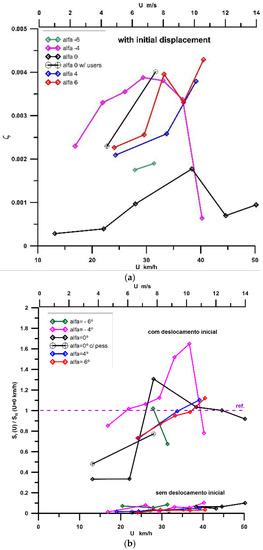The damping coefficient evolution, as a function of both wind velocity and the angle of attack, is shown in Figure 16a, its values being always positive with the initial displacement, drag playing a role in this behaviour.